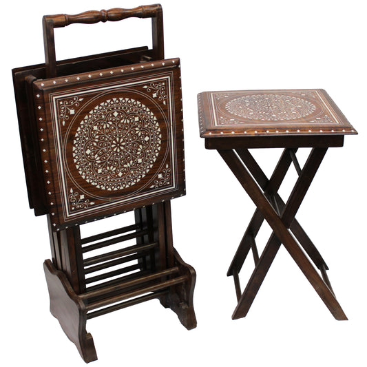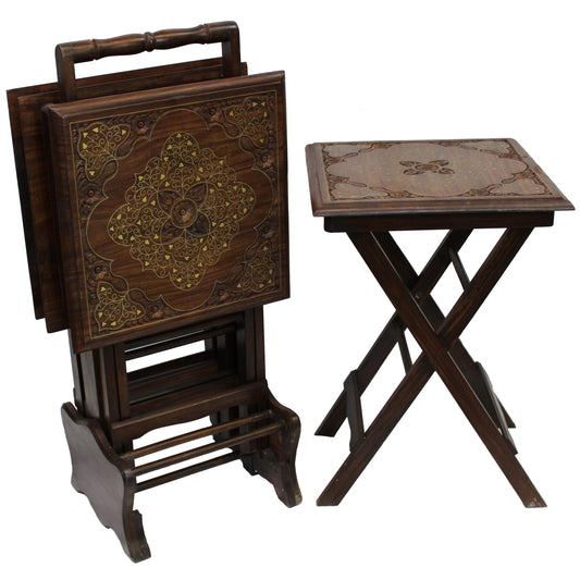Natural Geo Decorative Rosewood Set of 4 Tray Tables with Stand - Carved Floral