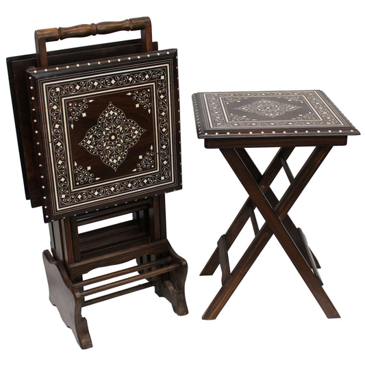 Natural Geo Decorative Rosewood Set of 4 Tray Tables with Stand - White Diamond